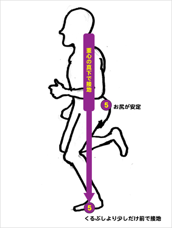 ⑤足先は前へ出し過ぎず、重心の真下(くるぶしより少しだけ前)にくるよう着地し、地面を押し出す意識(一本下駄を履いて走ることをイメージ)